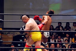 伊橋さらにボディ連打からフック(右写真)、マイケルダウン。飯伏「レフェリー、続行。」