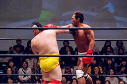 伊橋首投げ、コーナーに上ってダイビングパンチ、マイケルも下からパンチ出し(左写真)ダブルノックダウン。ここで3ラウンド終了。