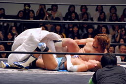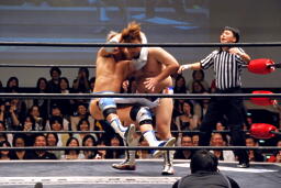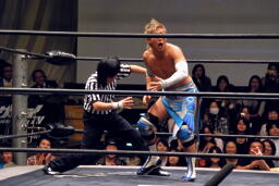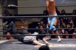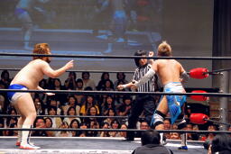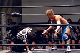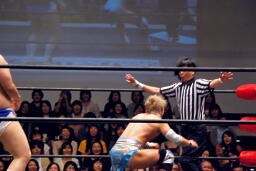 ディーノが木曽レフェリーに激突(右写真)、木曽レフェリー耐えて「ファイト!」