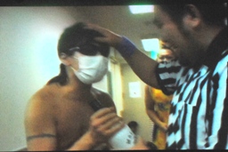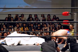 そうこうする間に木曽レフェリー復活。リング上(布団の中)は大変なことになっていたので(右写真)木曽レフェリーはノーコンテスト宣告。