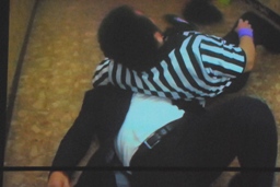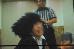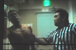 スクリーンには控室でモニターを見ていた松井さんの姿が。松井さんはリング上がハッテン場になったのを見て立ち上がる。サングラスを外し、控室を出る。立ちふさがるマイケルにビンタ(左写真)。