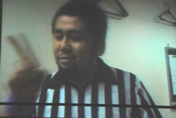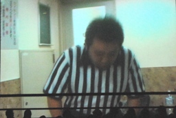 ディーノファイト・一発!、大石が木曽レフェリーにぶつかろうとするが直前でストップ(左写真)、「セーフ」
