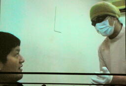 控室でボヤく石川のところに心霊治療の先生が(右写真)。「俺は強い」「俺は最強だ」「俺は蛇イアントだ」と繰り返し唱えさせてあっさり洗脳に成功。