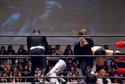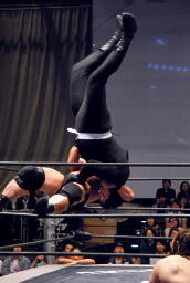 ポイズンがコーナーに詰める、MIKAMI入れ替わってモンキーフリップ狙う(右写真)、
