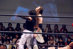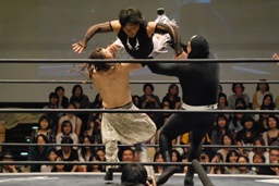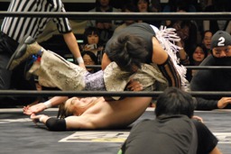 MIKAMIコーナーに上る、ポイズン雪崩式ブレーンバスター(左写真)、高木カット。