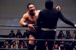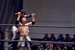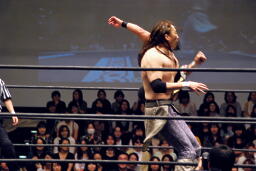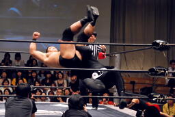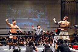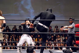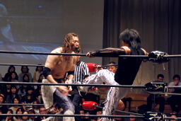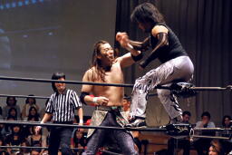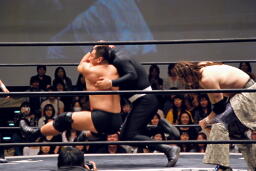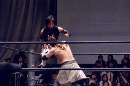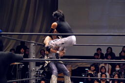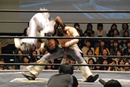 ポイズンMIKAMIをコーナーに上げる。MIKAMIブロック。「ポイズン!」「MIKAMI!」と叫びながらの打ち合いが途中から「篤男!」「恭平!」に(右写真)。