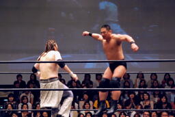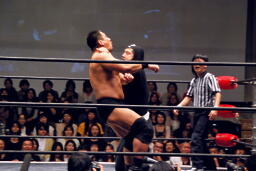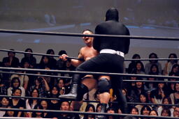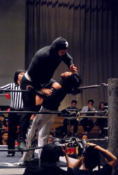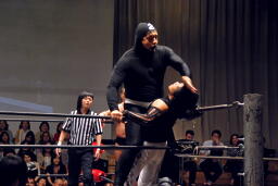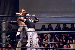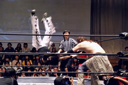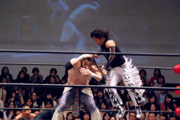 ポイズンガウンで高木の首を絞める(右写真)、南側客席中段まで行ってラリアット相打ち。