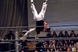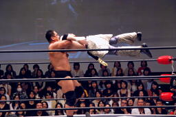 高木ぶっこ抜き雪崩式ブレーンバスター狙う、蛇イアントブロックして高木を突き落とす。蛇イアントコーナーに上る、高木ドロップキック、ぶっこ抜き雪崩式ブレーンバスター成功(右写真)。両軍タッチ。