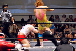 福田をコーナーに振って突っ込む、福田ショルダースルー(右写真)、遠藤はエプロンに着地。しかしばってんが急所攻撃、遠藤転落。