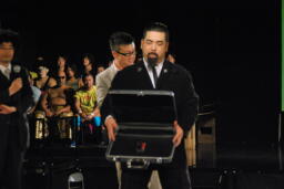 選挙管理委員の296さんがリングに。選挙結果の入ったアタッシュケースを開く(右写真)。