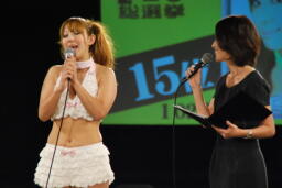チェリー両手の中指立てる。公約の「豊胸女子プロレス」は1位じゃないので保留、だそうだ(右写真)。観客「えー」美央「えー、じゃない!」