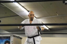 千春、宏樹をセコンドにヌンチャク持参で入場(右写真)。木曽レフェリーがボディチェックするがヌンチャクはスルー。