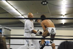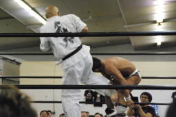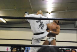マイケルロープに飛ぶ、千春カウンターの前蹴り。千春ヌンチャクでマイケル殴打、コーナーに詰めてキック、前蹴り(左写真)。