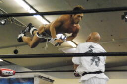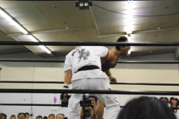 ヌンチャク持ってコーナーに上りダイビングショルダーブロック(左写真)、カウント2。5分経過。