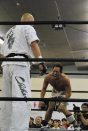 千春はマイケルの「お前も男ならヌンチャク置け!」というアピールを聞き入れヌンチャクを置いて試合開始。手四つ(右写真)。