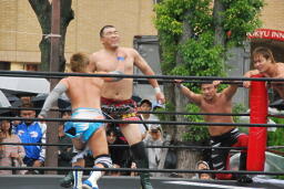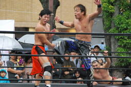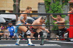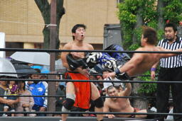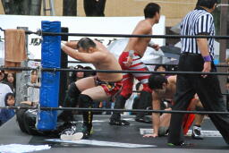 HARASHIMA切り返す、MIKAMIがコーナーからダイブしてHARASHIMAにチョップ(左写真)。
