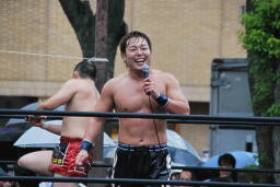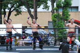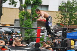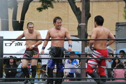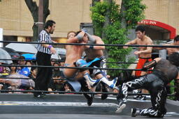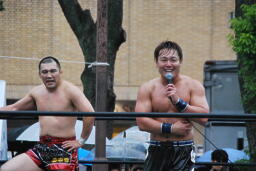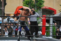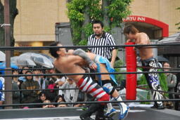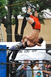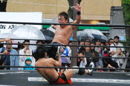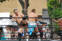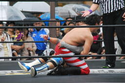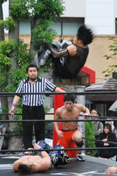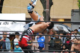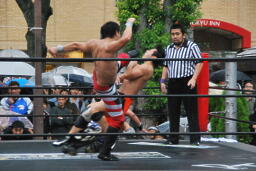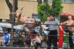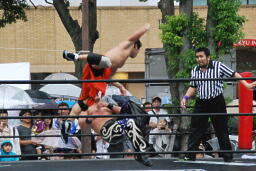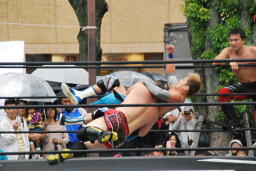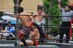 もう一発バックドロップ(右写真)、カウント2。妻木にタッチ。