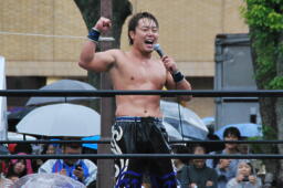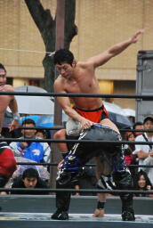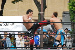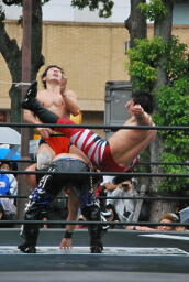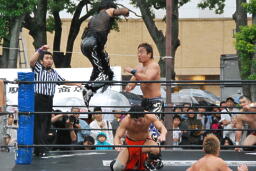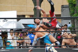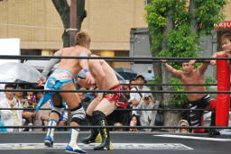 HARASHIMAエプロンに出てスワンダイブプレス、高梨かわす(左写真)。