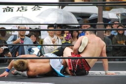 大石パロ・スペシャル狙う、佐藤ブロックして両足すくうとアキレス腱固めに(右写真)。