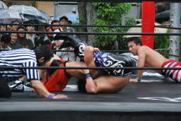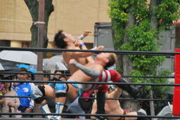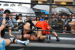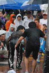 びしょ濡れで場外乱闘する2人(右写真)。