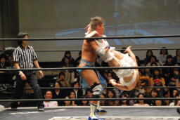 大石ジャンピングネックブリーカードロップ(右写真)、カウント2。