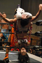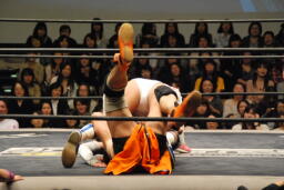 美央コーナーに振る、高梨切り返して突っ込む、美央かわして後頭部にハイキック、トップロープに上ってぶら下がり首4の字(右写真)。