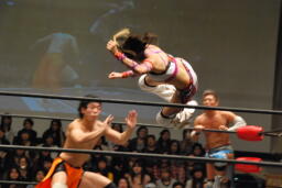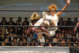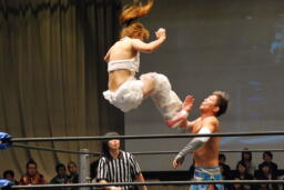 大石入ってダブルでロープに振る、チェリーは側転でクローズラインをブレークして2人にクロスボディ、大石と美央受け止める(左写真)。
