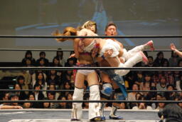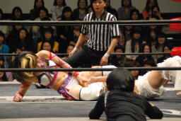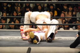 コーナーに振って美央串刺しニーアタック、美央が大石に振る、大石はスパインバスターからテキサスクローバーホールド(左写真)、高梨ロープ。大石は美央にタッチ。