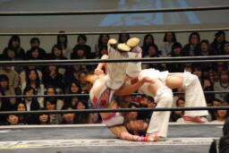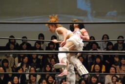高梨がチェリーの背中にドロップキック打ち込んで倒す(右写真)。