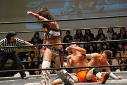 美央入って高梨の腕を2人でひねって座らせると大石がドロップキック、美央がサッカーボールキックのサンドイッチ(右写真)。