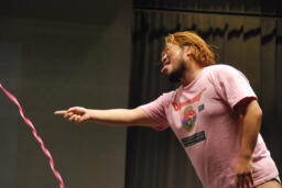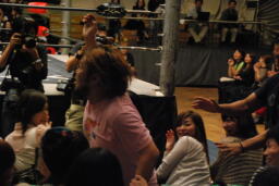 新藤リングアナも「いつもにも増して・・・(はぁ)・・・ホモです」というくらい気合の入った今日のディーノ。物凄い勢いで客席を荒らし回る(右写真)。