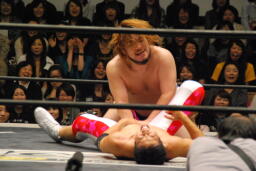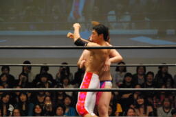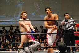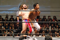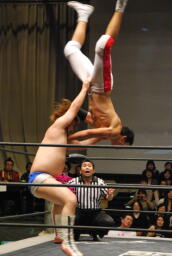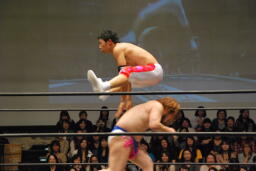 後方回転で相手に跳び越させるムーブ、しかしディーノは上からのしかかる(左写真)。これは危ない体勢だ。肩が着いていたためカウント入る、竹下2でキックアウト。