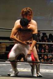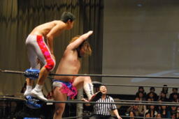 再度ロックアップ、ディーノまたキスを狙ってロープに押し込む、竹下体勢入れ替えてエルボースマッシュ(右写真)。