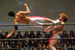 竹下フライングメイヤー、ディーノヘッドシザーズ。ディーノフライングメイヤー、竹下ヘッドシザーズ(右写真)でブレーク。