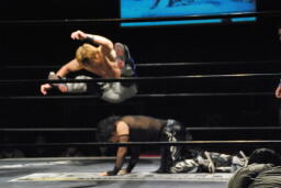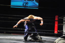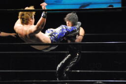 MIKAMIはHARASHIMAにスク〜ルボ〜イ、カウント2。コーナーに上って450°スプラッシュ、HARASHIMAかわす(左写真)。