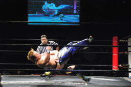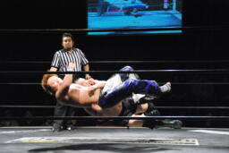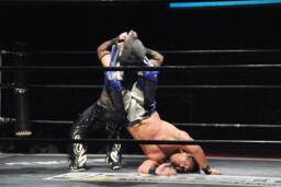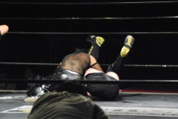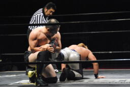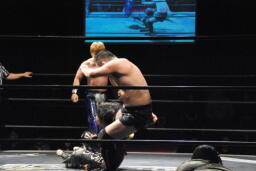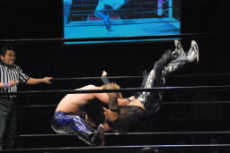 HARASHIMA再度肩に担ぐ、今度は足をクロスしてラッシーボム(左写真)、カウント2。