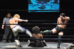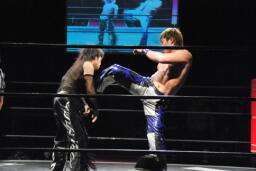 HARASHIMAと佐藤リリースするとダブルのローキックからダブルのサッカーボールキック(右写真)、カウント2。