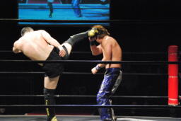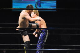 HARASHIMA正面跳びドロップキック(右写真)、MIKAMI吹っ飛ぶ。15分経過。