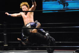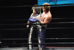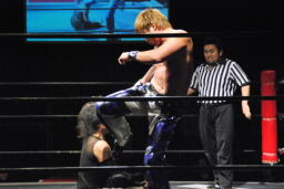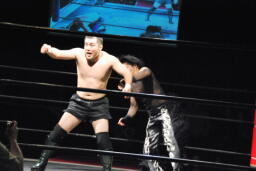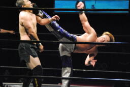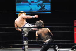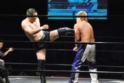 佐藤首投げからサッカーボールキック(右写真)、カウント2。