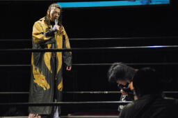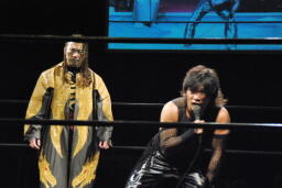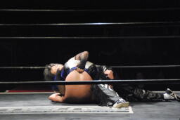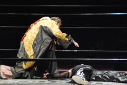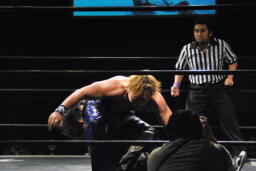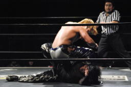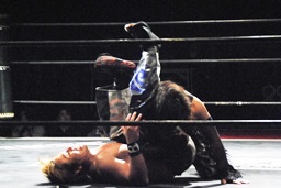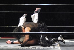 また倒れたMIKAMIにポイズンは手かざし(左写真)。MIKAMI立ち上がり、四方に礼して退場。