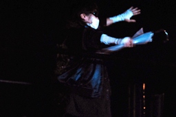 ニラが暗闇の中無音で入場。リングに入るとスポットライトに照らされまるで何かの犯人のように慌てる(右写真)。