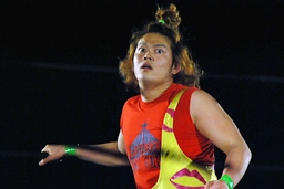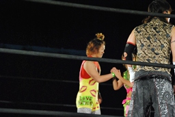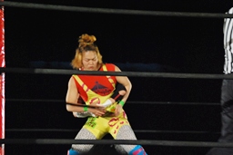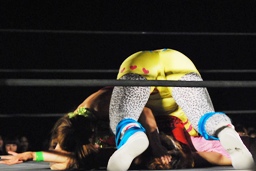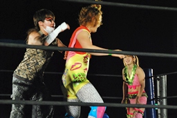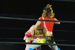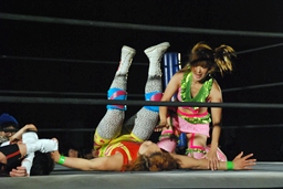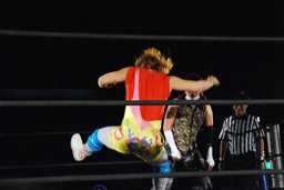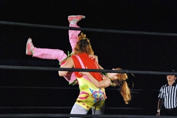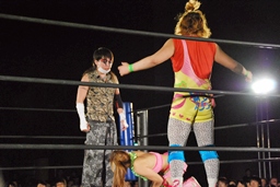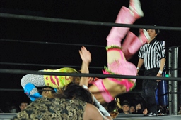 ニラと福田ダブルでロープに振る、チェリークローズラインを側転でかわして2人にドロップキック、2人スカす(右写真)。