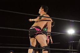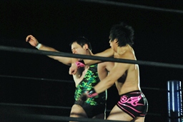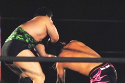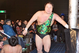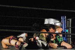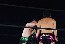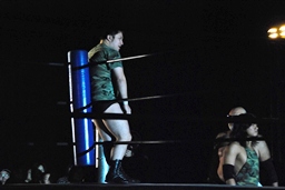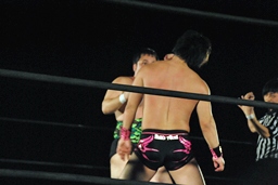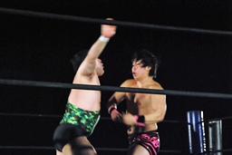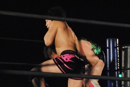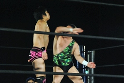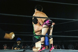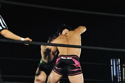アントンパンチ連打(右写真)、石井ソバット、ロープに飛んでジャンピングニー、カウント2。