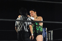 石井コーナーに振る、アントン切り返し木曽レフェリーにぶつける。木曽レフェリーがダウンしてる間にアントン急所打ち(右写真)。