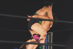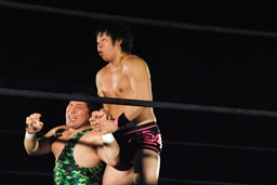 石井エルボー(左写真)。石井エルボー連打、アントンはロープを引き下げて石井を場外に落とす。