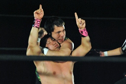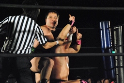 石井高角度ダブルアームDDT(左写真)、カウント3。