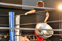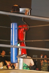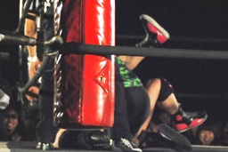 アントンコーナーに突っ込む、石井カウンターのキック、コーナーに上ってミサイルキック(右写真)。