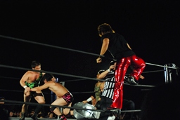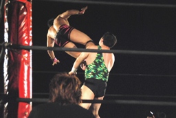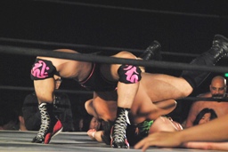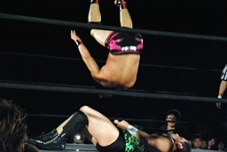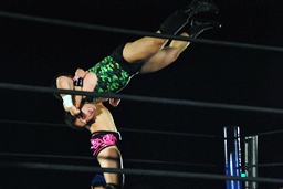 ロープに振ってヒップトスからサマーソルトドロップ(左写真)、カウント2。