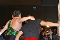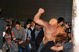 アントンも場外に(右写真)。アントン石井を客席に叩きつける。