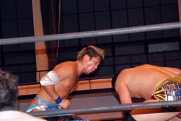 ロックアップ、佐藤ヘッドロック、大石佐藤の髪をつかむ(右写真)。いきなり!大石エビ固めに、カウント1。